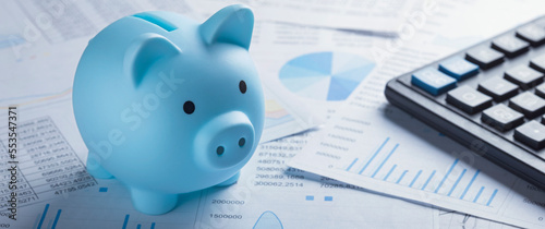 pig money box for money on background with calculator and financial charts. Investment and capital accumulation concept