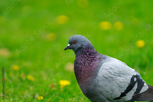 Pigeon on the green background. Pigeon walking on the green lawn.