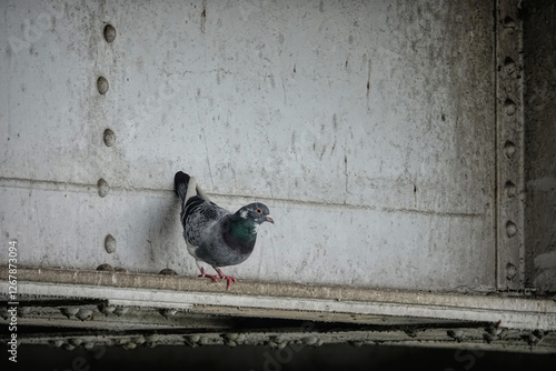 Pigeon perched on a weathered metal beam, showcasing urban wildlife in a gritty, industrial setting.
