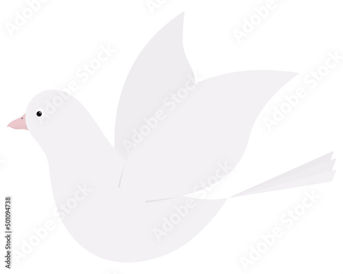 Pigeon. The white bird flaps its wings. Pigeon is a symbol of peace. Snow-white bird with a pink beak. Color vector illustration. The bird is flying into the sky. Isolated background. Flat style.