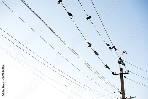 Pigeons are sitting on wires, birds sitting on power lines over clear sky