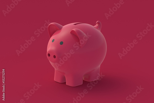 Piggy bank of magenta on red background. Color of the year 2023. 3d render