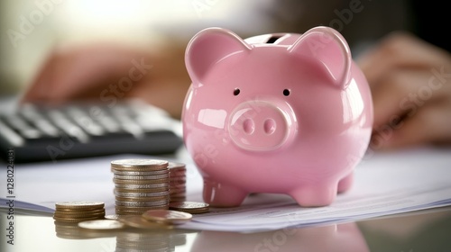 Piggy bank on table, office background