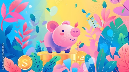 Piggy Bank with Flowers and Eggs in Nest and Grass