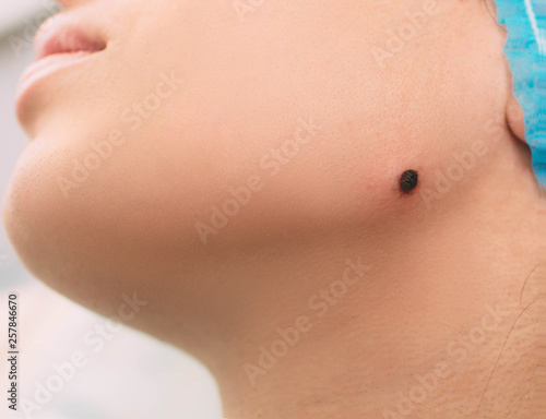 Pigment nevus on the female face, close-up. Part of series radio wave electrocoagulation remove method