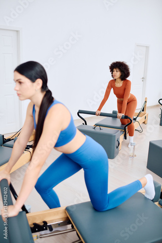 Pilates enthusiasts practicing movements with reformers in a bright studio environment