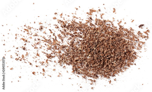 Pile chopped, milled chocolate with hazelnut isolated on white background, top view