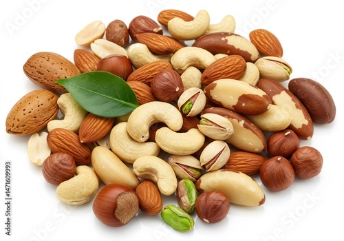 Pile of assorted nuts with green leaf on white background, healthy snack