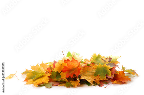 Pile of autumn colored leaves isolated on white background.A heap of different maple dry leaf .Red and colorful foliage colors in the fall season