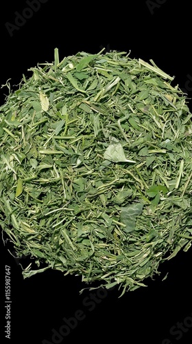 Pile of chopped green hay or grass, ideal for animal feed or compost. Fresh and vibrant green color.