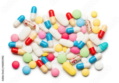 Pile of colorful medications, assortment of pharmaceutical products in studio
