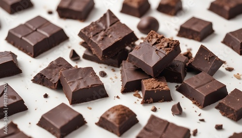 Pile of dark chocolate pieces and shavings, Pile chopped, milled chocolate isolated on white,