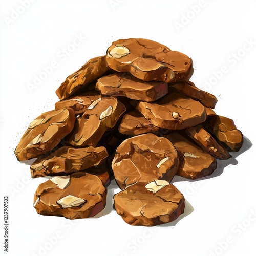 Pile of Delicious Brown Cookies with White Chocolate Chips on a White Background