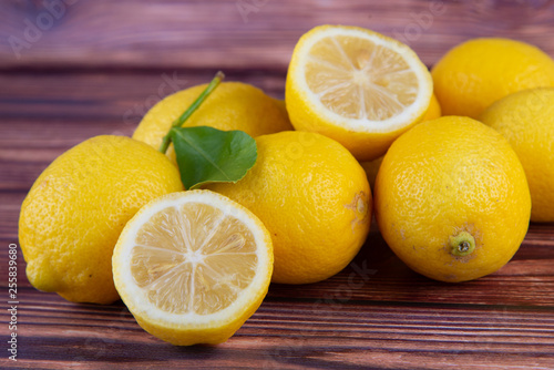 Pile of delicious citrus fresh yellow lemons and green leave on brown wooden table