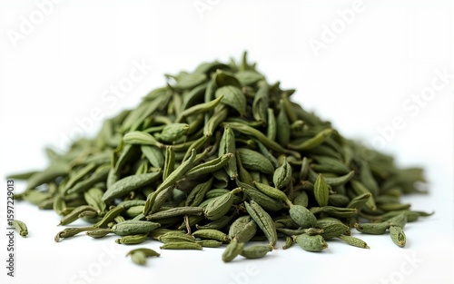 Pile of dried green tea leaves isolated on transparent background, close-up detail. Organic beverage ingredient concept. High quality