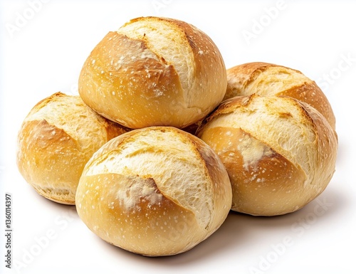 Pile of fresh baked bread rolls stacked on white background in studio shot
