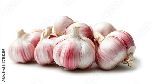 Pile of Fresh Garlic Bulbs Displaying Characteristic Stripes on White Backdrop