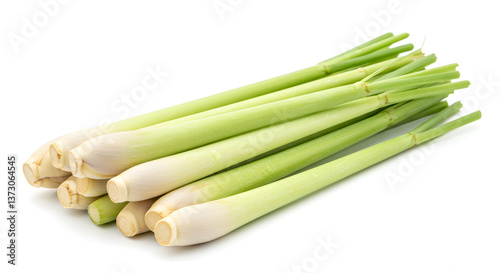 Pile of fresh lemongrass stalks arranged on a clean white background studio setting