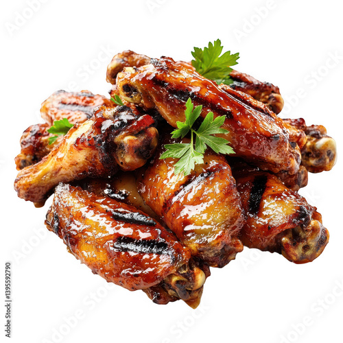 Pile of glazed chicken wings garnished with fresh green parsley on transparent background