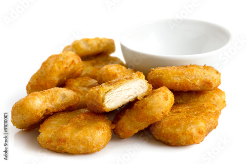 Pile of golden deep-fried battered chicken nuggets with empty bo