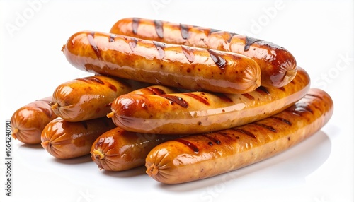 Pile of grilled sausages with distinct grill marks and rosemary garnish.