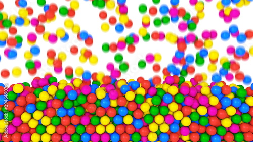 Pile of gumballs fill screen with colorful rolling and falling balls. Multicolored spheres in pool for children fun abstract transition. Bright 3D animation for composite overlay with alpha channel