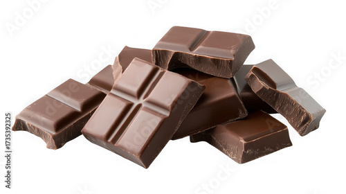 Pile of milk chocolate squares isolated on transparent background, close up view
