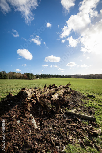 Pile of old logs in the middle of a huge field of grass. Set aside land on a bright summers day with blue sky and puffy white clouds.