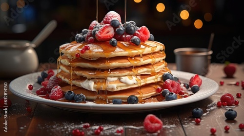 pile of pancakes with melted sweet syrup and fruit toppings with a blurred background