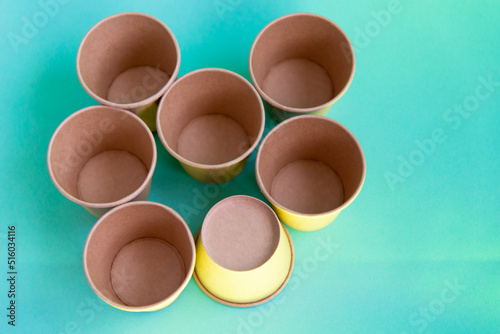 Pile of paper coffee cups lighted with yellow color. Soft selective focus, blurred. Blue background
