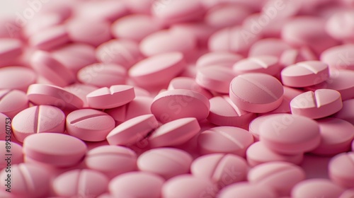 Pile of pink pills on white surface close up medical concept, health care and treatment theme