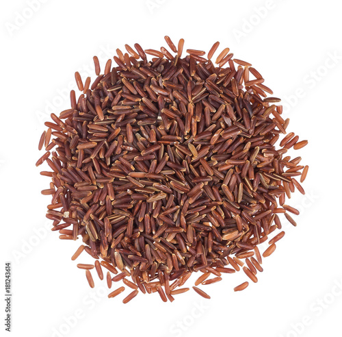 Pile of red rice groats isolated on white background. Top view