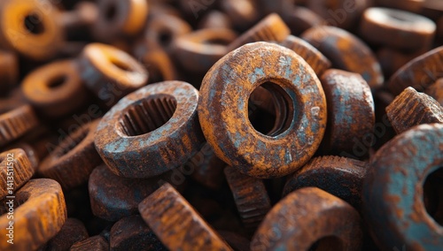 Pile of Rusty Metal Washers, Close-Up View