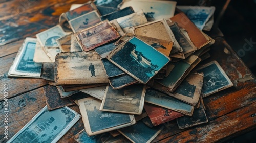 Pile of vintage photographs on a rustic wooden surface evoke nostalgia and history