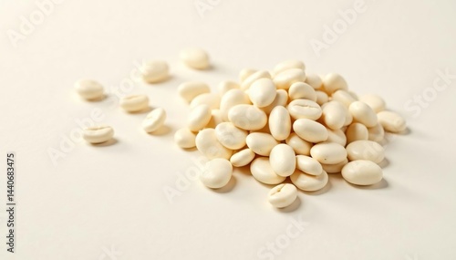 Pile of white beans against a plain white backdrop, organic, bright, cooking
