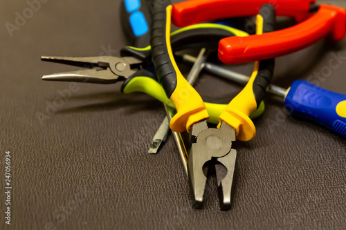 pile of wire cutters screwdriver closeup of pliers lots of hand tools grunge style on dark background design base