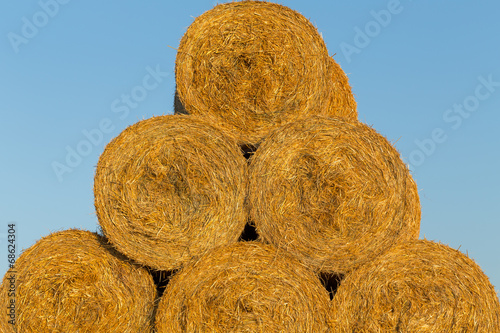 Piled hay bales on a field against blue sky