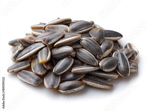 Piled sunflower seeds showing striped shells and some yellow tips on a white surface
