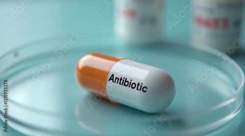 Pill Labeled Antibiotic Displayed on a Petri Dish With Bottles in the Background