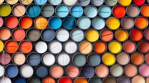 Pills arranged by color in a painter's palette, top-down view, vivid colors, neat organization, sharp focus, clean white background, high contrast, hd quality, natural look. --ar 16:9 --v 6.