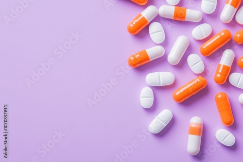 Pills on purple background. Multicolored vitamins, free space for text. Many different capsules. Pharmacy, chemistry. Abundance. Lots of antibiotics, drug. Herbal medicine, chemical industry. Top view