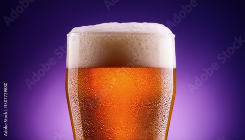 pilsner glass filled with beer against purple backdrop