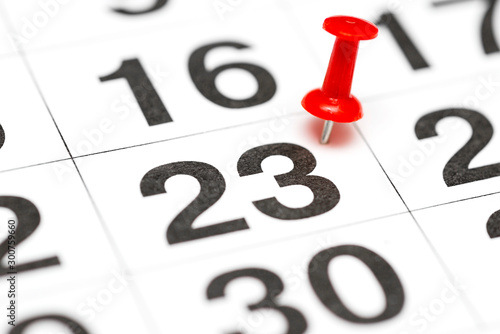 Pin on the date number 23. The twenty third day of the month is marked with a red thumbtack. Pin on calendar