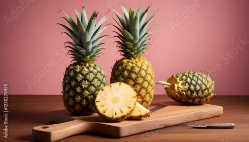 Piña en rodajas sobre una tabla de madera, con una piña entera y un cuchillo al fondo