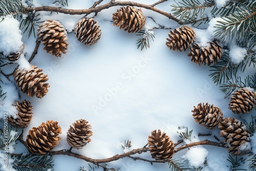 Pine cones and branches on snowy background. Winter frame with natural elements. Rustic holiday decor. Cold season flat lay. White and brown tones