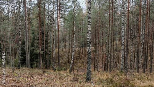 Pine, spruce and birch trees grow in the forest. The soil is covered with moss, grass and fallen leaves. In late autumn, almost all the leaves have fallen from the trees. Overcast weather