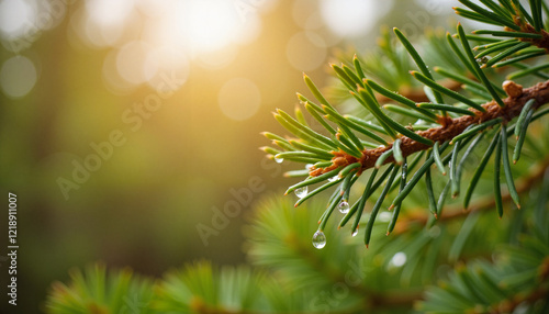 Pine tree branch with water droplets against soft sunlight