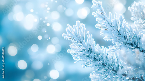 Pine tree branches with snow and ice on a light blue blurry background with copy space. Christmas and winter background illustration.