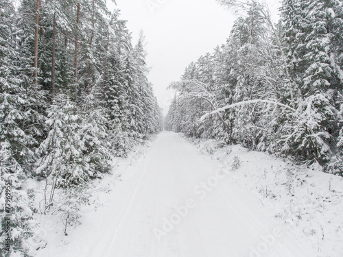 Pine Tree Forest in Winter in Lithuania. Drone Point of View. Road in the Middle of the Frame
