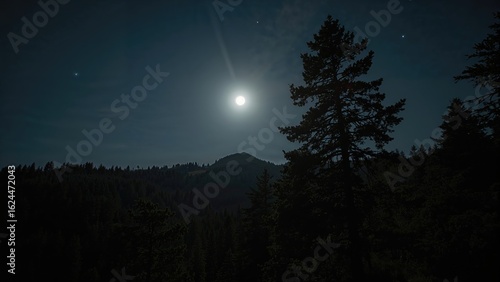 Pine tree shadows stretching over rugged terrain beneath a clear night sky